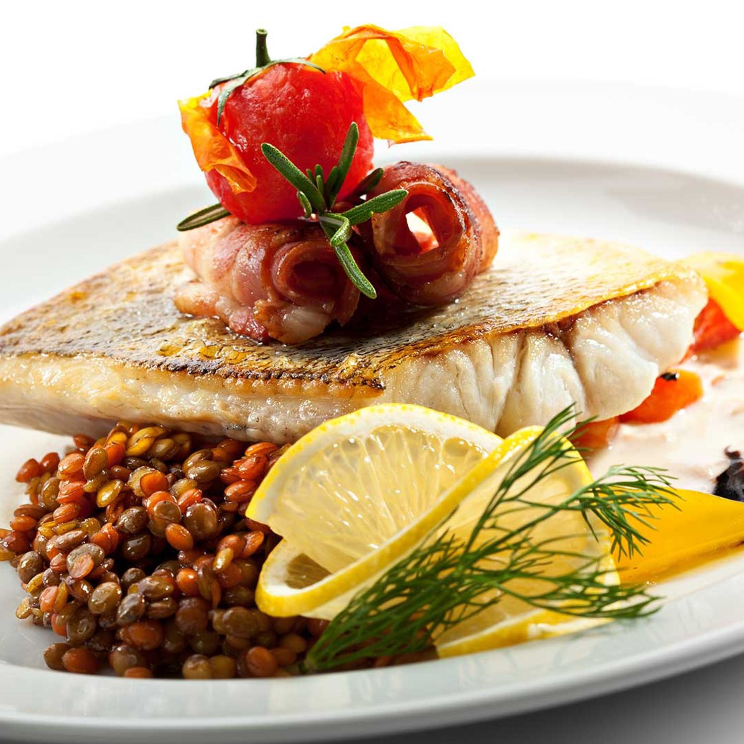 Die kalorienarme Kost „Wallerfilets auf Linsen Schnittlauch Vinaigrette“ eignet sich perfekt für ein leichtes Abendessen.