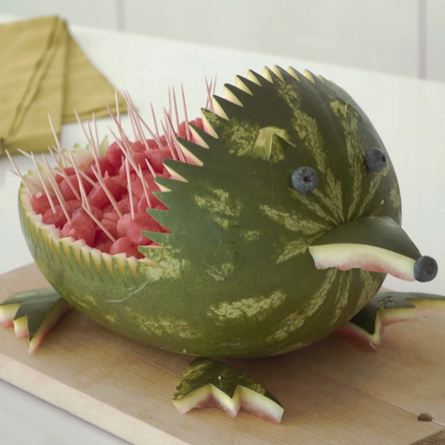 Igel mit Melonenbällchen füllen und mit Zahnstochern stacheln.