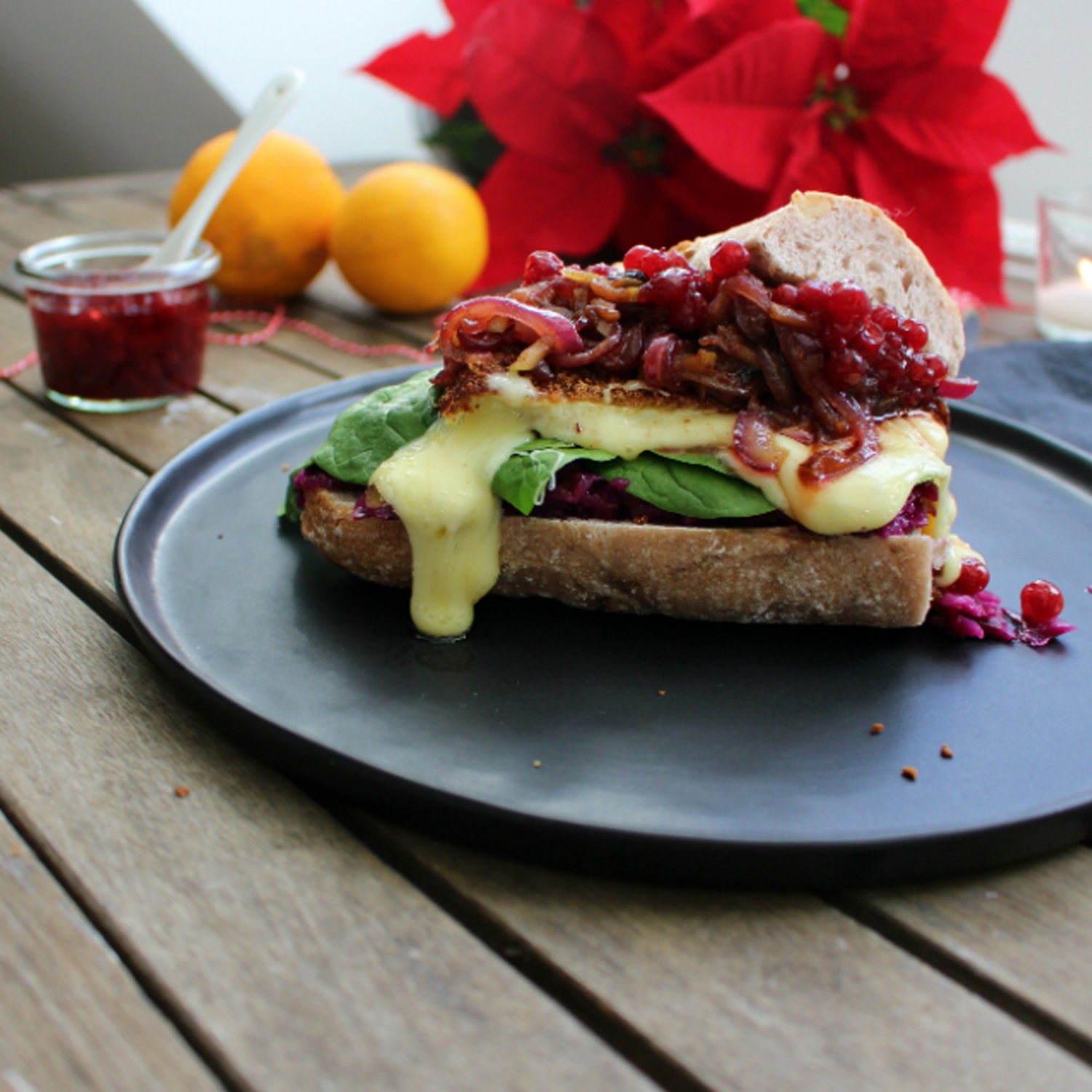 Nun ein Weckerl nach Wahl aufschneiden und mit Rotkraut, Salat, dem gebackenen Käse, Preiselbeeren und den karamellisierten Balsamico-Zwiebeln belegen.
