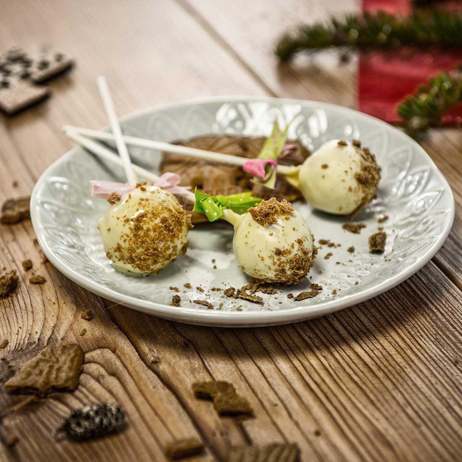 In der Zwischenzeit den Spekulatius fein hacken. Nach der halben Stunde die Cake-Pops in der geschmolzenen, aber nicht zu heißen Kuvertüre schwenken, bis sie komplett bedeckt sind. Kurz bevor die Kuvertüre vollständig getrocknet ist, mit dem Spekulatius dekorieren.