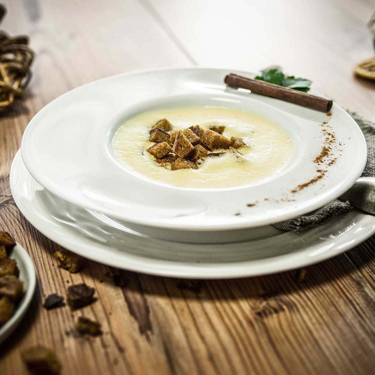 Dazu reicht man in Butter geröstete, kleine Brotwürfel, die mit Zimt bestreut werden. Guten Appetit!