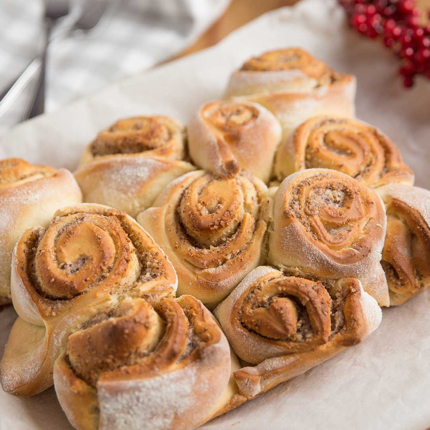 Zu einem dünnen Strudel einrollen, in 4–5 cm breite Stücke schneiden, in zerlassene Butter tauchen und in ein befettetes, feuerfestes Geschirr einlegen. Die Schnittfläche muss am Boden aufliegen.