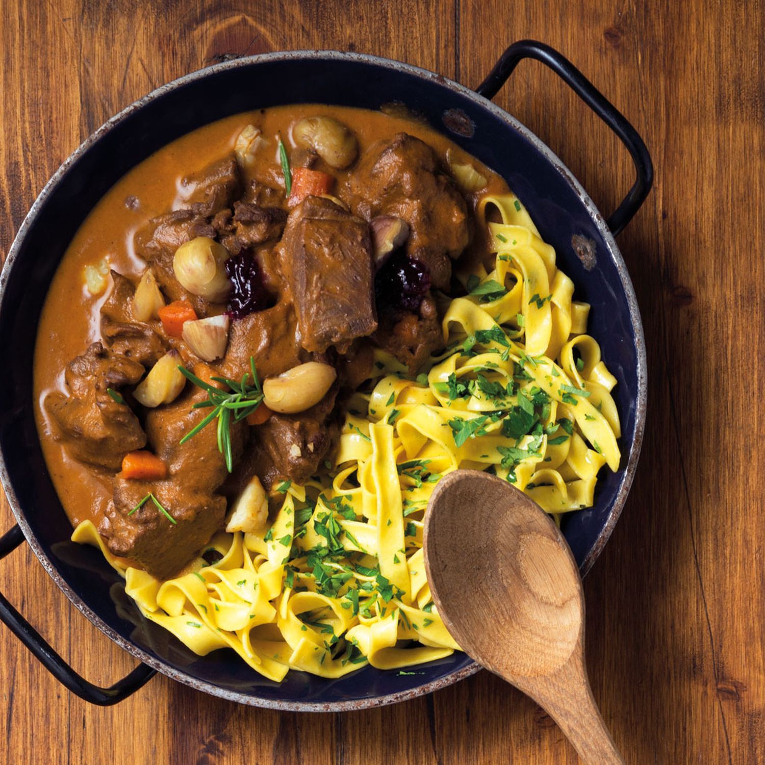 Ein Gaumenschmaus für Wild-Liebhaber: Verwöhne deine Gäste mit dem köstlichen Wildragout mit Maroni und Kräuternudeln!