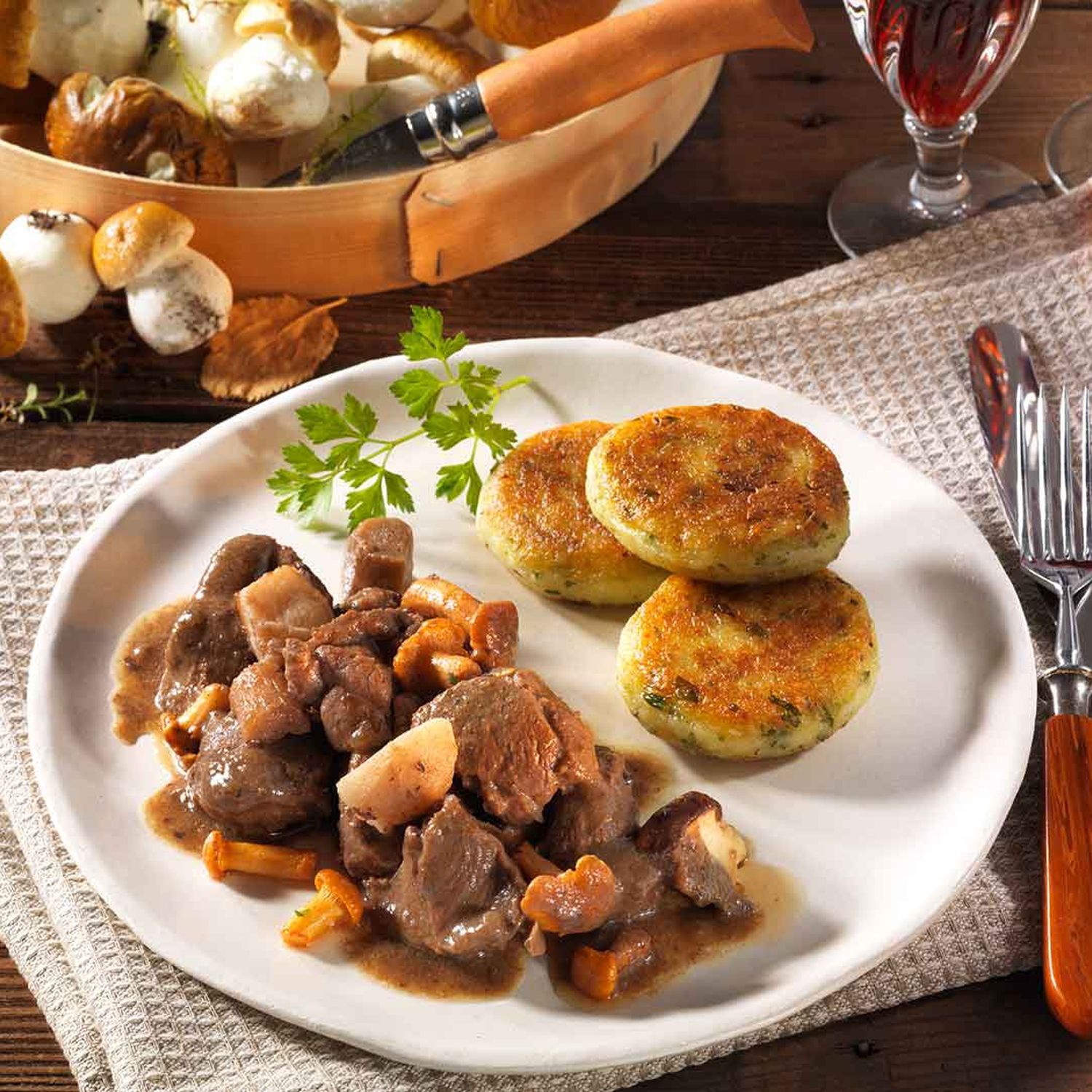 Wildschwein-Pilzgulasch mit Kartoffelkeksen