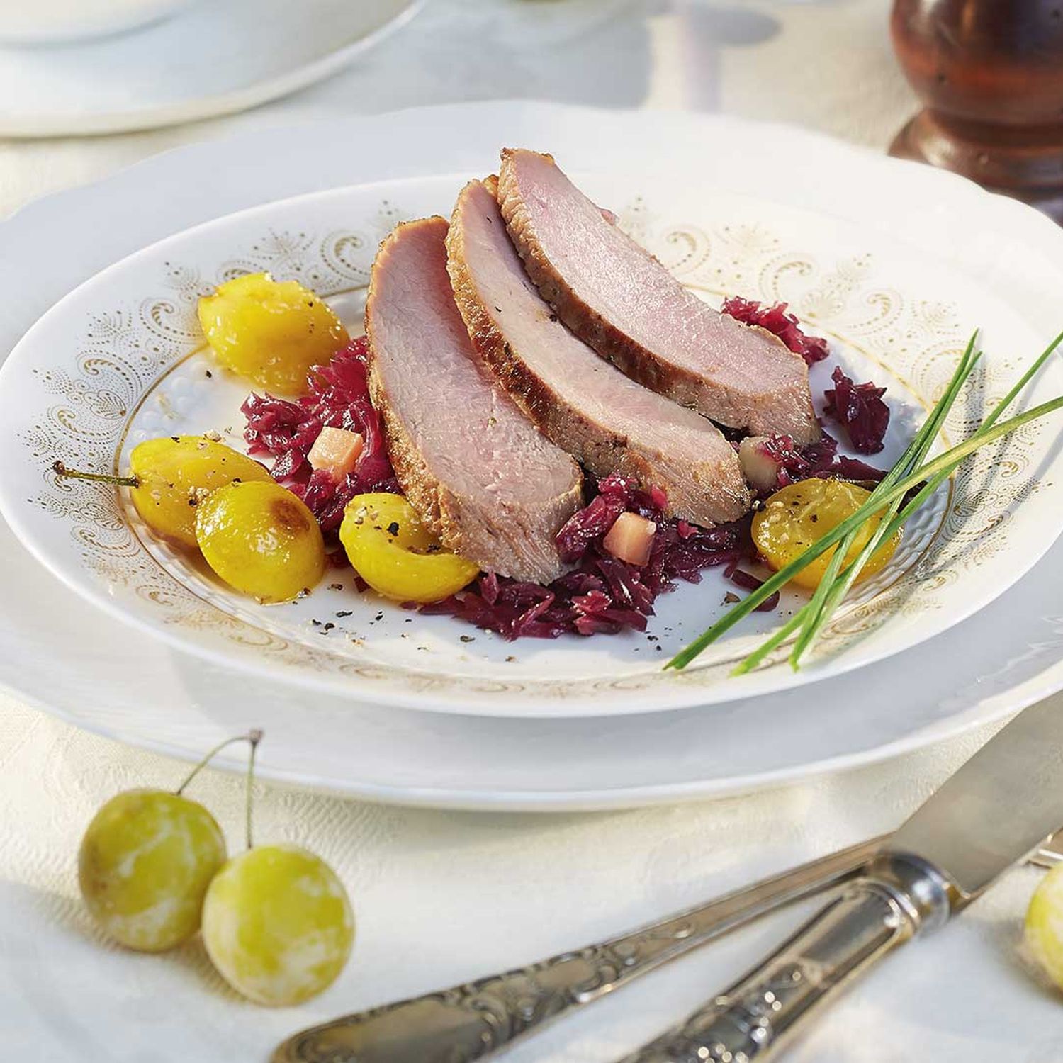 In der Zwischenzeit das Rotkraut erwärmen und auf Tellern anrichten. Am Ende der Garzeit den Wildschweinrücken aus dem Ofen nehmen und auf das Rotkraut setzten. Mit den entkernten und halbierten Pflaumen garnieren, mit Pfeffer bestreuen und servieren.
