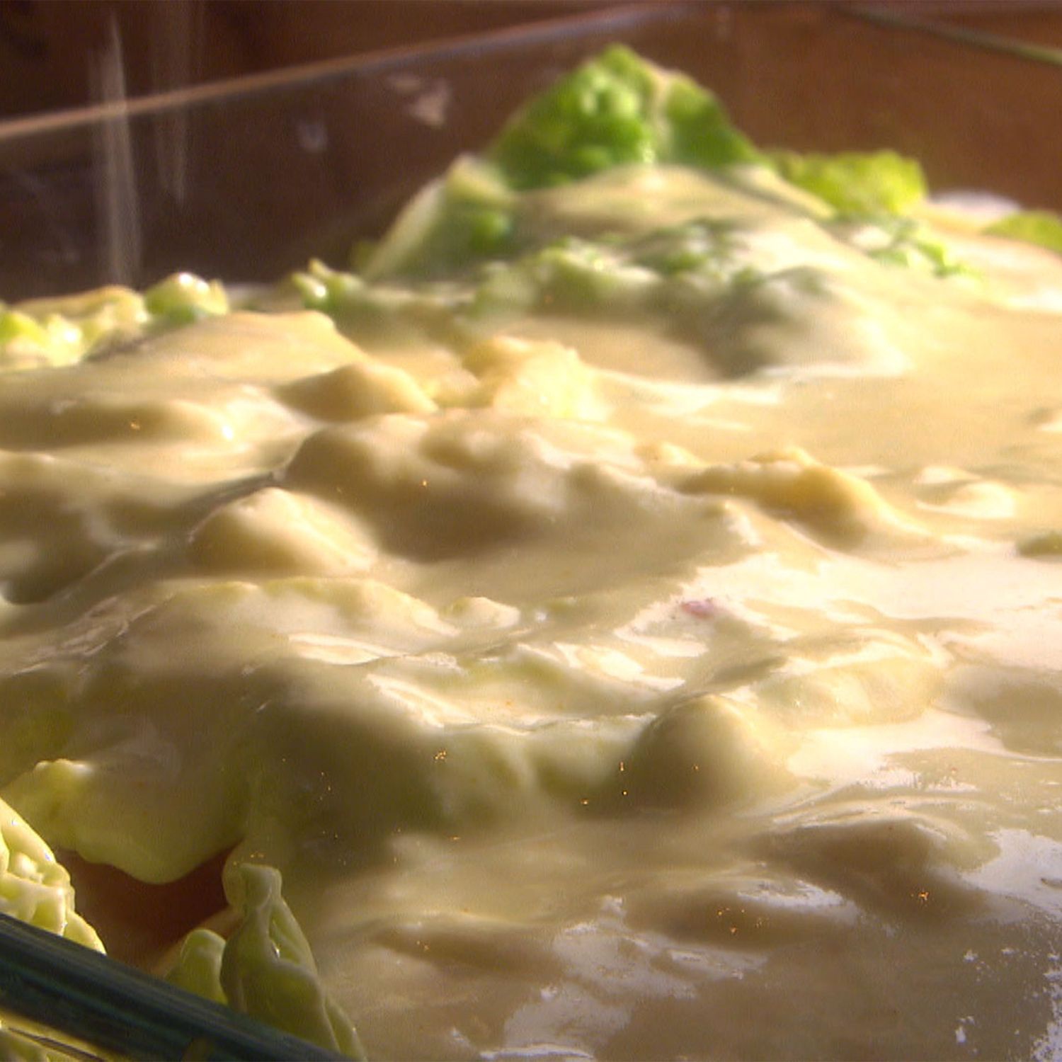 Nun das Gemüse abwechselnd mit der Bechamelsoße in die Auflaufform schichten. Mit Bechamelsoße abschließen und das Ganze mit dem geriebenen Hartkäse bestreuen. Im auf 180−190 °C vorgeheizten Backrohr (Ober- und Unterhitze) 35−40 Minuten backen.