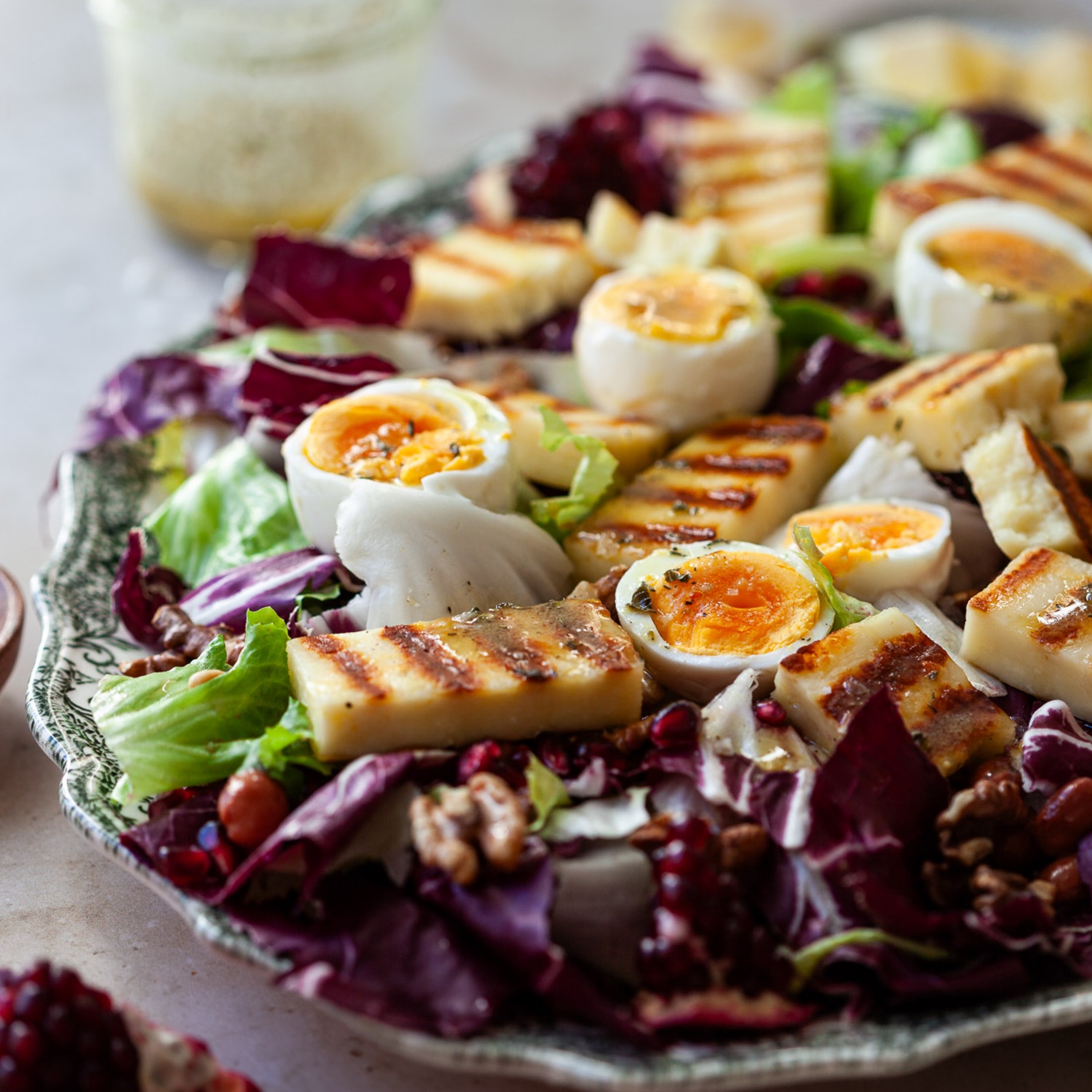 3. Den Granatapfel halbieren und die Kerne über den Salat streuen. Zum Schluss das Dressing über den Salat träufeln und servieren.