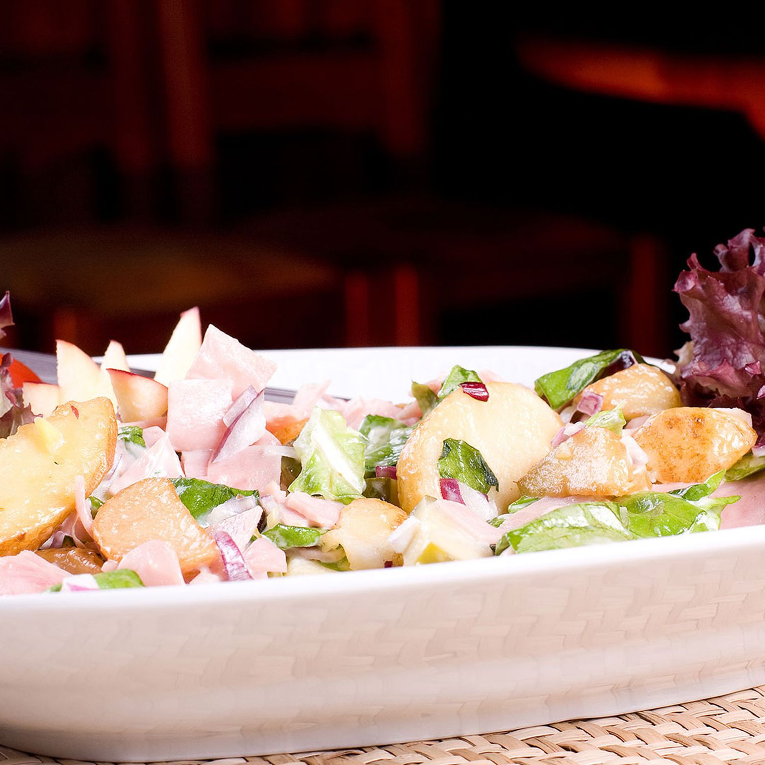 Die Äpfel waschen, vierteln, entkernen und in grobe Stücke schneiden. Den Sellerie samt Dünstsud, die klein geschnittenen Wurstscheiben und die Äpfel zu den Zwiebeln geben, den Schnittlauch hinzufügen und alles mischen.