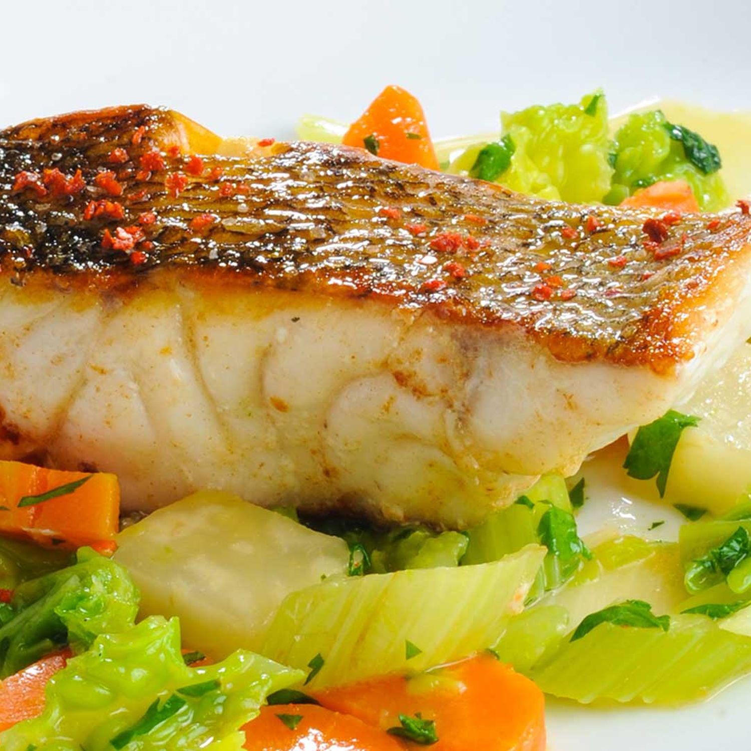 Das Gemüse auf warmen Tellern verteilen und die Fischfilets mit der Hautseite nach oben darauf anrichten.