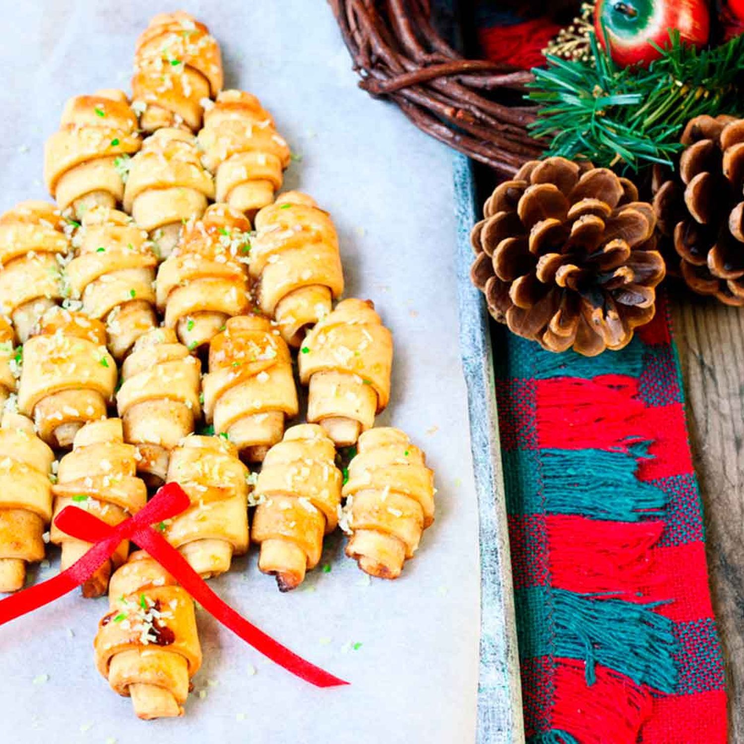 Zuerst den Teig aus der Packung nehmen. Wenn die vorperforierten Teigstücke zu groß sind, einfach die Dreiecke halbieren oder vierteln. Auf diese Weise entsteht auch die notwendige Menge an Mini-Croissants, um diese am Ende wie einen Tannenbaum arrangieren zu können.