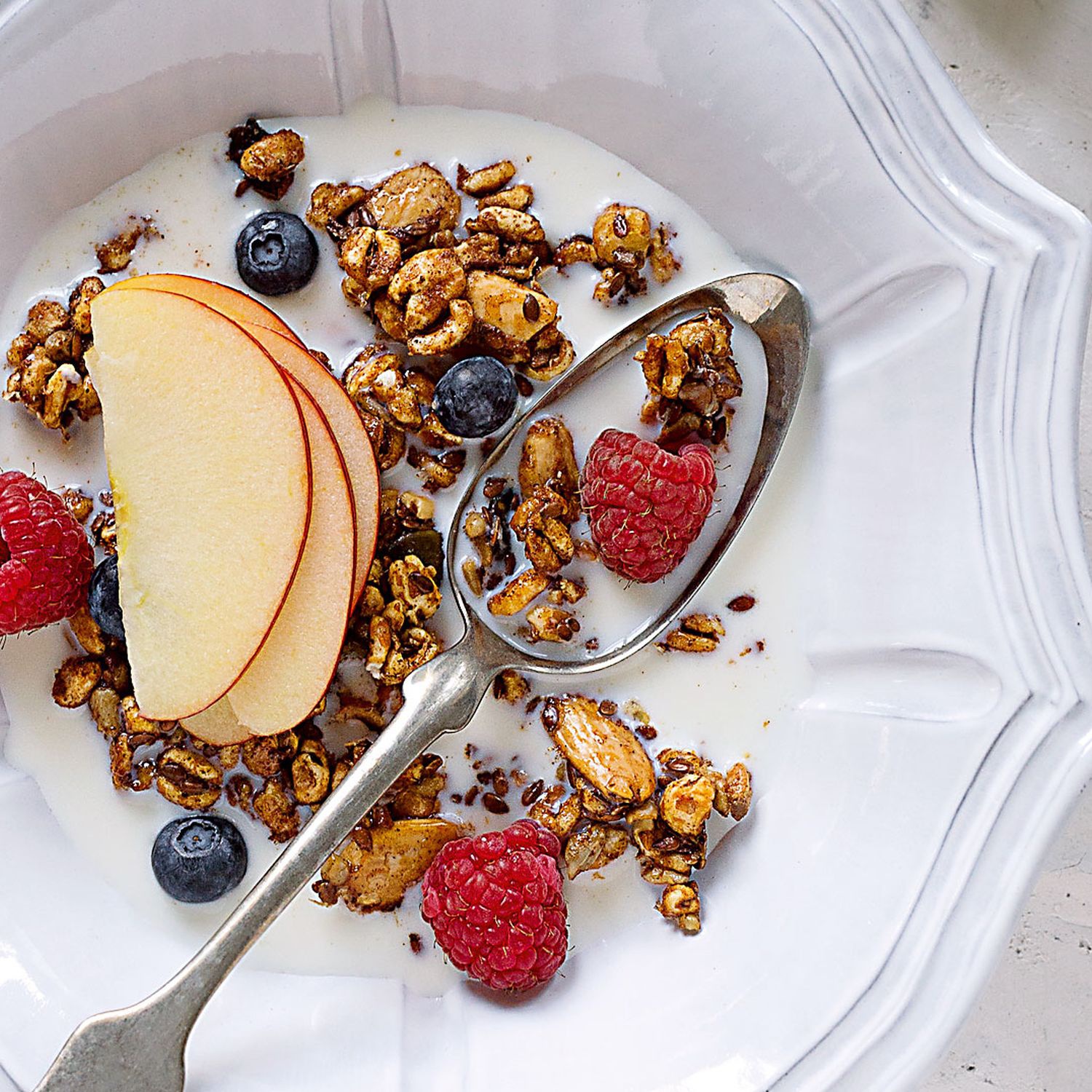 Das Granola mit Milch, Himbeeren, Heidelbeeren und einem halben Apfel servieren.