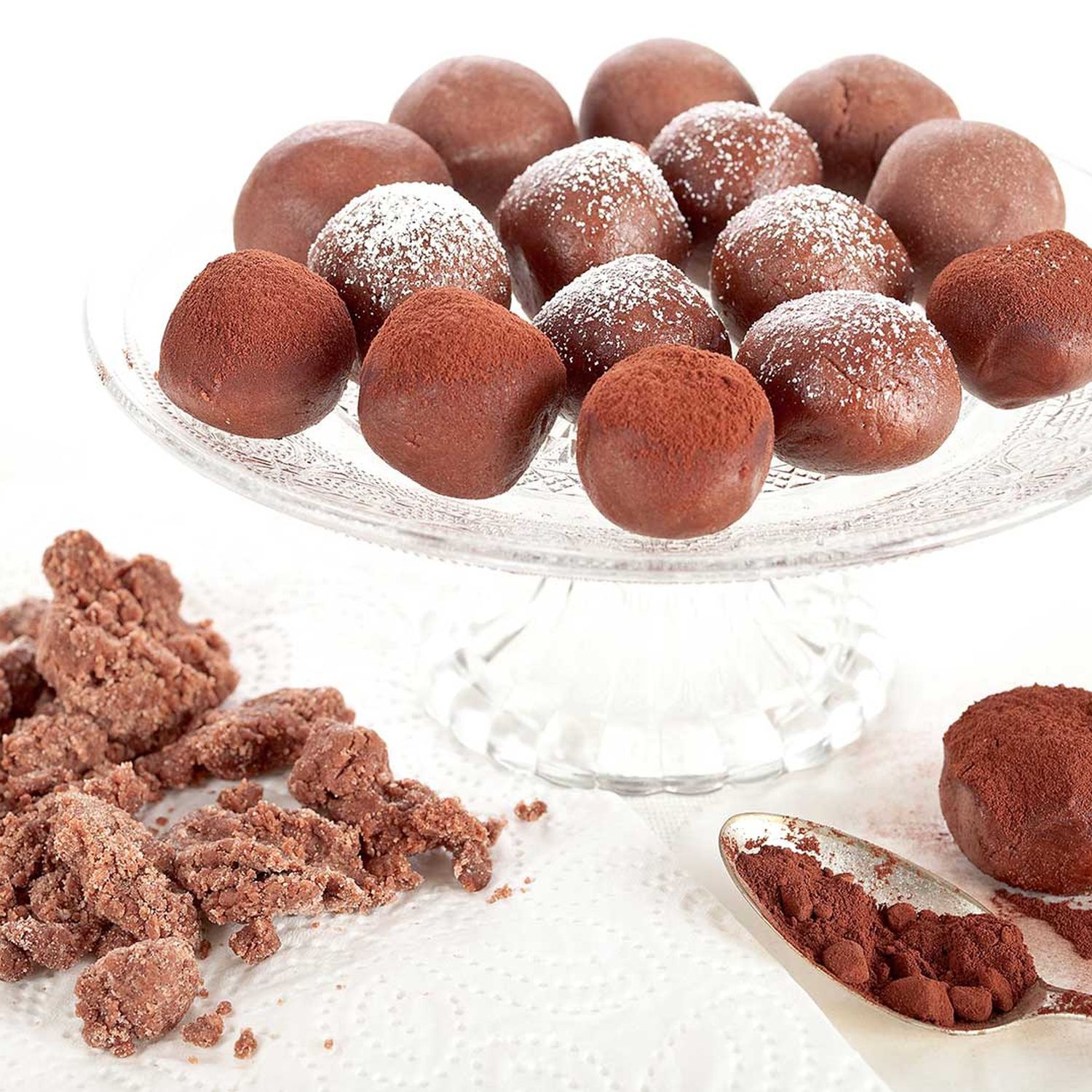 Kokosfett leicht erwärmen, bis es flüssig ist. Staubzucker und Kakaopulver sieben.