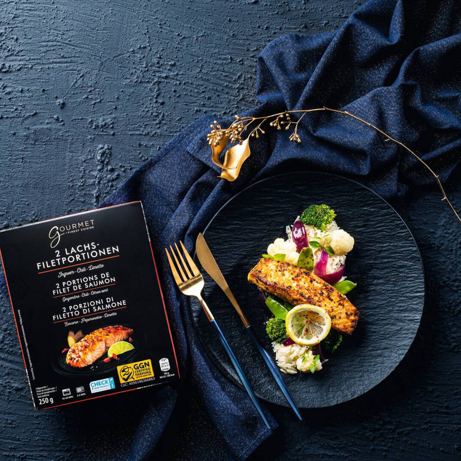 Den GOURMET Lachs im Ofen nach Packungsanleitung zubereiten.