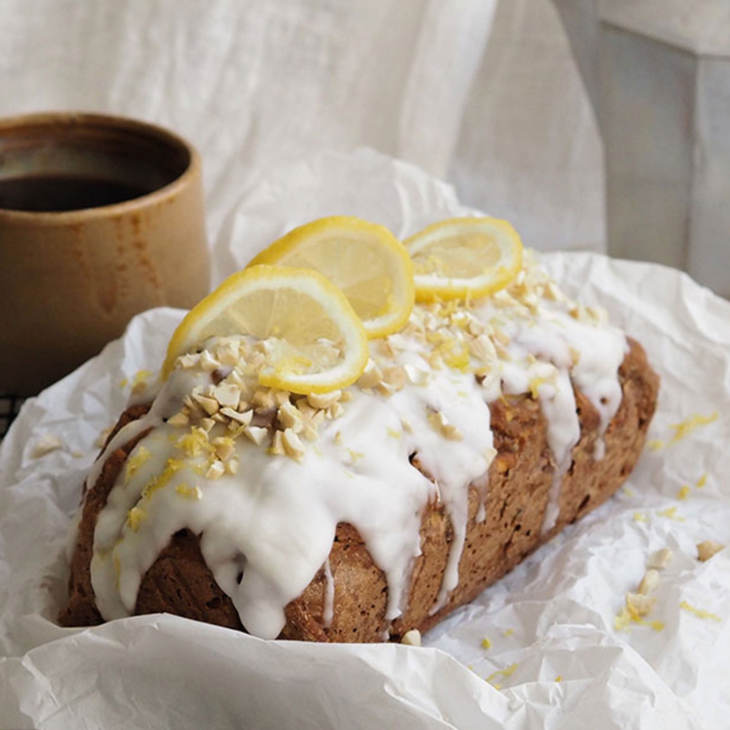 Ist der Kuchen fertig, diesen kurz abkühlen lassen. Zuletzt kommt die Glasur drauf und dann die Cashewkerne und der Zitronenabrieb.