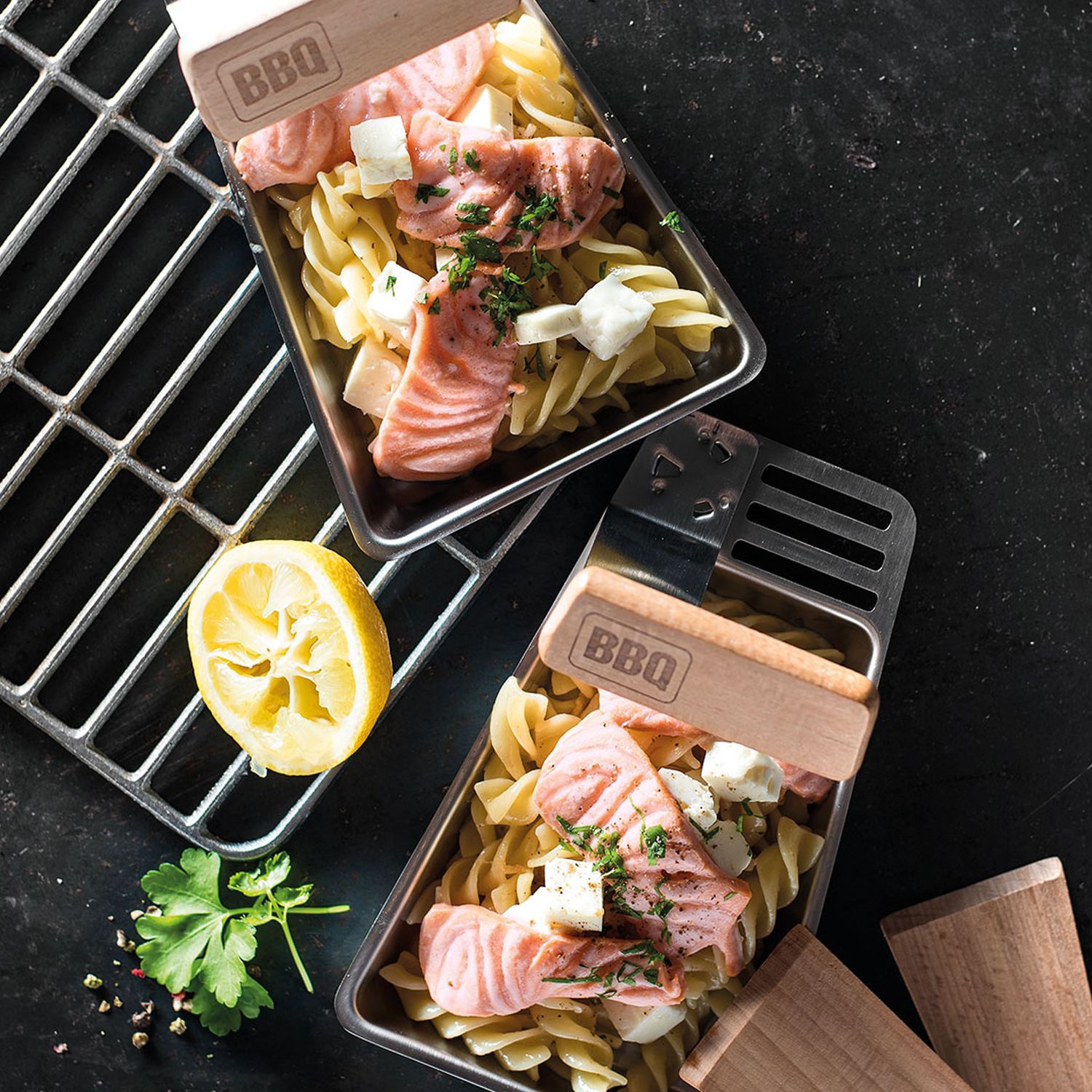 Die Pasta unter das Gemüse mischen und in die Grillpfännchen fllen. Mit Lachs und Fetakäse belegen und für ca. 4–5 Minuten zugedeckt grillen.