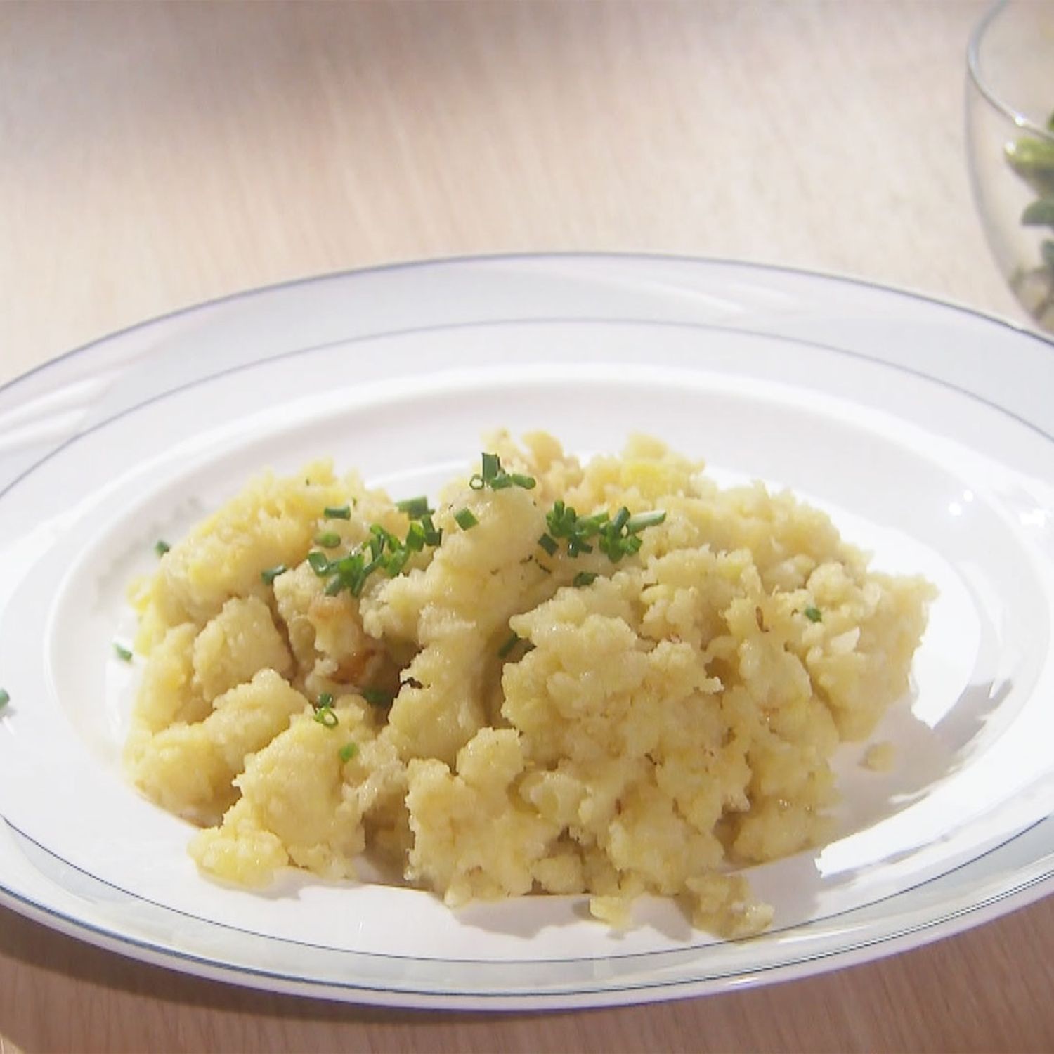 Mehl über die Erdäpfel streuen. Zugedeckt weiter kochen lassen, bis das Mehl eine Art Deckel bildet, den man dann einige Male mit dem Kochlöffelstiel durchbohrt. Überschüssiges Wasser abgießen. Erdäpfel und Mehl zusammen stampfen.