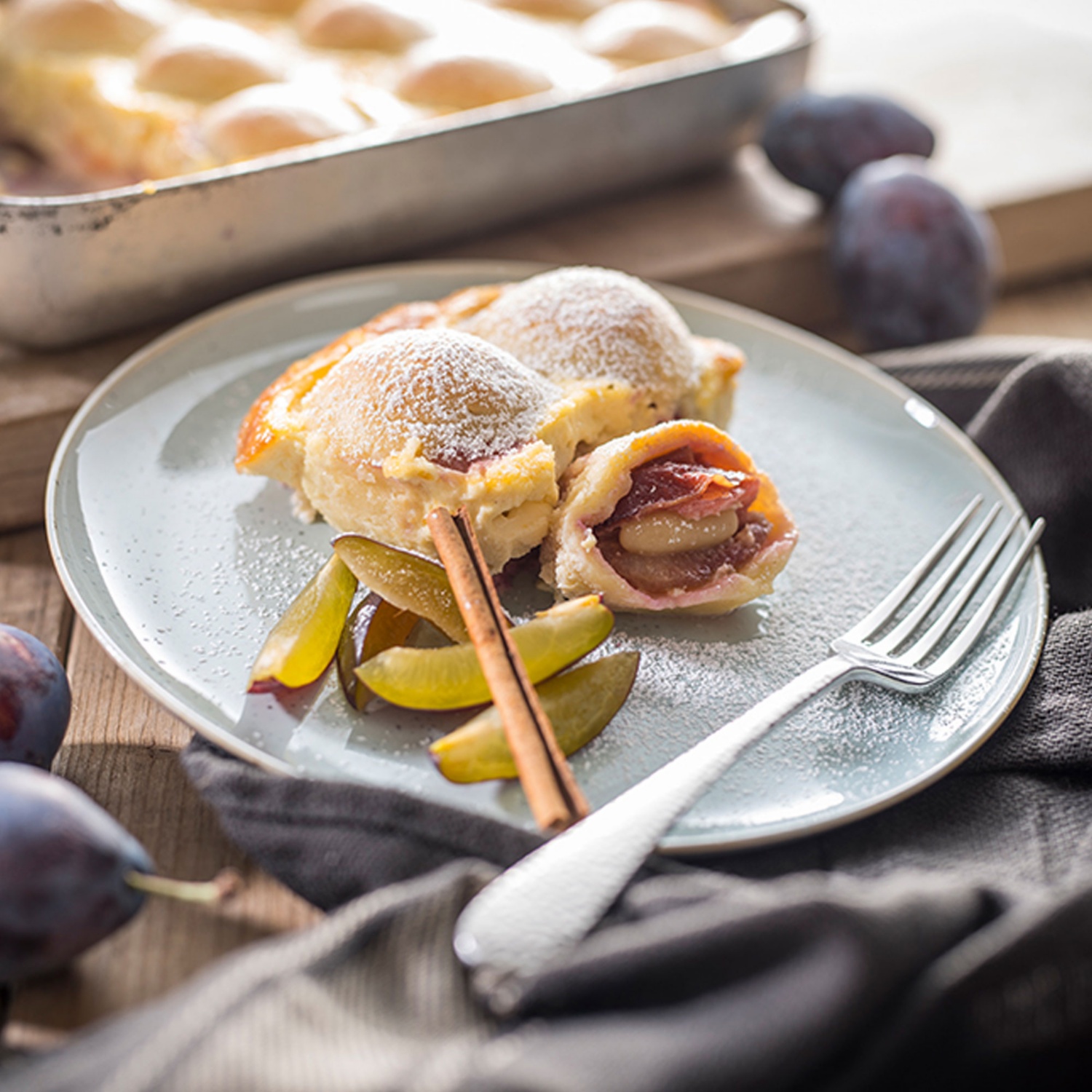 Die Knödel in eine gut gefettete Auflaufform nebeneinander setzen. Zwischen die Knödel je eine geviertelte oder halbe (je nach Größe) Zwetschke stecken.