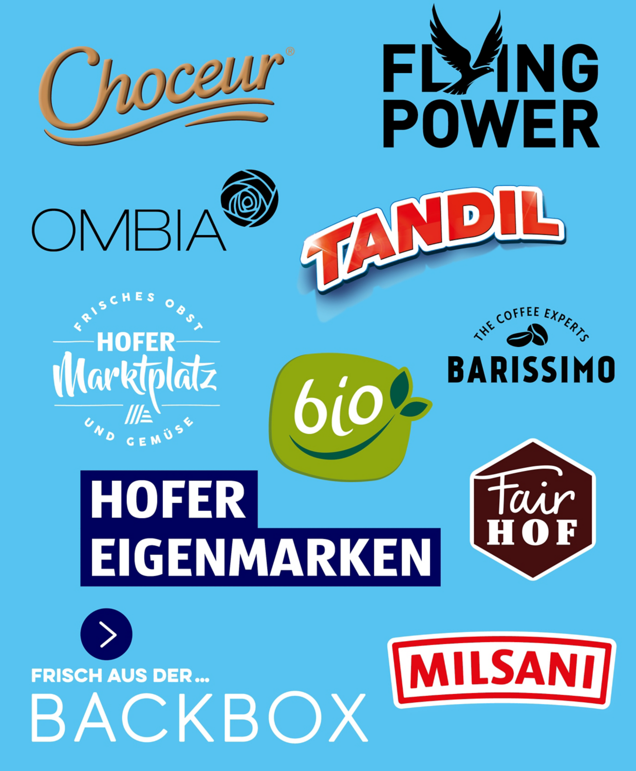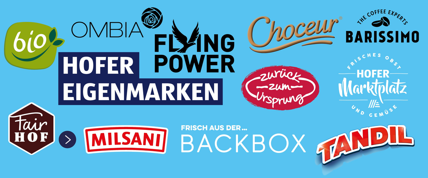 Verschiedene frische Gemüsesorten hinter blauem Banner „ALLES FÜR DEN TÄGLICHEN BEDARF“.