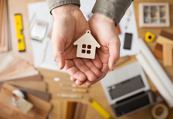 Ein Mann und ein Kind mut Mütze helfen zusammen, um einen Nagel in ein Holzwerkstück zu hammern.