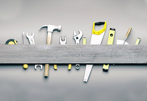 Vater und Sohn sind in der Werkstatt. Der Sohn trägt eine Brille und hält einen elektrischen Bohrer in der Hand.