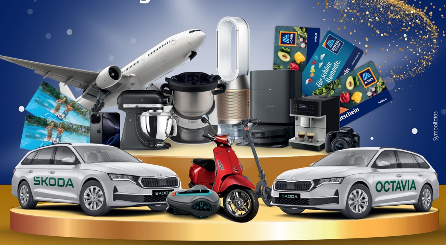 (Sattledt, 28. November 2025; HOFER) In weniger als einem Monat ist Weihnachten und die Vorfreude auf das große Fest steigt von Tag zu Tag. Was das zugleich bedeutet: Der HOFER Adventkalender ist wieder zurück. Wer sich bereits in der Vorweihnachtszeit eine große Freude machen möchte, hat vom 1. bis zum 24. Dezember jeden Tag die Chance, einen von vielen großartigen Gewinnen bei HOFER abzustauben. Gleich hinter dem ersten Türchen warten hier zum Beispiel fünf iPhone 17 Pro mit einem Jahr HoT FIX inklusive auf ihre glücklichen Gewinner, am 2. Dezember können sich Teilnehmende auf den ersten von zwei Skoda Octavia freuen und am Tag darauf auf zwei Übernachtungen für zwei Personen im 4 Sterne Hotel „der WILDe EDER“ in St. Kathrein am Offenegg. Am Feiertag, 8. Dezember gibt es drei CANON EOS 250D Spiegelreflexkameras mit Objektiv sowie ein gratis Fotobuch von HOFER FOTOS. Und so geht es täglich weiter, jeden Tag besteht die Chance auf eine neue Überraschung, um für Kund:innen die Vorfreude auf das Weihnachtsfest noch mehr hochleben zu lassen. Ein kleiner Vorgeschmack auf die vielen weiteren tollen Preise: vom BOSCH Cookit über ein Rennrad und HOFER REISEN Gutscheinen bis hin zum Gaming-PC Komplettsystem.
